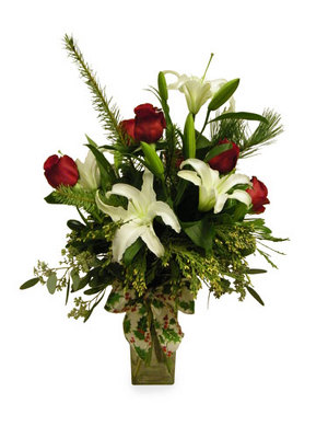 Red Roses and White Lilies arranged in holiday greens. *Red Roses are in limited supply for the holiday*